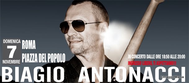 (Da MondoMusicaBlog) Che Biagio Antonaggio sia una grande personaggio, oltre che una grande persona, era ben risaputo, lo dimostra una volta di più quando ci sono grandi eventi e, quando è necessario aiutare i più deboli, lo ha fatto per i terremotati d’ Abruzzo e lo rifarà domenica 7 novembre, quando sarà in concerto gratuito in Piazza del Popolo a Roma, per il quale non ha voluto alcun compenso, preferendo devolvere la cifra ai figli dei soldati scomparsi in Afghanistan.