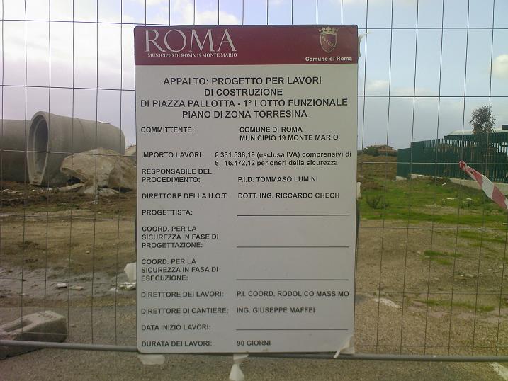 Piazza Gino Pallotta, prevista nel PdZ B32Torresina, era stata finanziata nel 2007 dalla Giunta Veltroni; PER ACCELERARE I LAVORI, furono incaricati della realizzazione gli uffici tecnici del Municipio XIX ; i lavori furono divisi in 2 lotti per permettere la fruizione dell’area vicino all’Asilo prossimo all’inaugurazione.