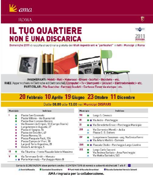 Il Tuo quartiere non è una discarica. Torna l ’ iniziativa giunta al la sua XI I edizione. Domenica 11 dicembre 2011, ultimo appuntamento dell’anno con la raccolta straordinaria gratuita dei rifiuti ingombranti e “particolari” dalle 8.00 alle 12.30 nei Municipi dispari ed i quartieri del Porta a Porta.