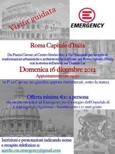 a causa delle condizioni metereologiche siamo costretti ad annullare la visita guidata di domenica 16 dicembre “Roma Capitale d’Italia”, tenuto, altresì, conto che tutto il percorso si sarebbe svolto all’aperto. Vi ringraziamo per il vivo interesse manifestato e Vi informeremo sulla prossima data in programma. Per favore informate anche i Vostri contatti.