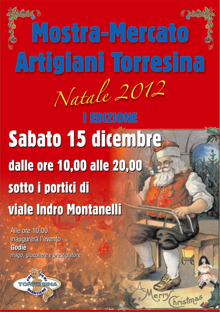 Sabato 15 dicembre (e a grande richiesta Sabato 22 !!!) dalle ore 10,00 alle ore 20,00 sotto i portici di viale Indro Montanelli si terrà la Prima Mostra Mercato Artigiani di Torresina.