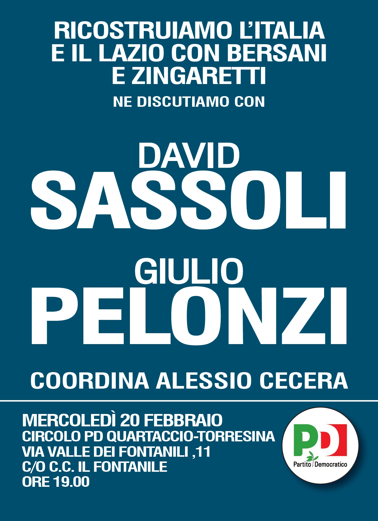 Mercoledì 20 febbraio il candidato alle primarie per il Sindaco di Roma David Sassoli ritorna a Torresina per sostenere le candidature di Bersani e Zingaretti ed approfondire tematiche locali.