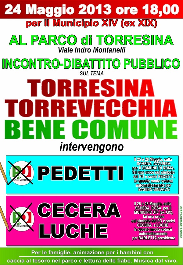Pierpaolo Pedetti candidato Assemblea Capitolina (ex consiglio Comunale), Valerio Barletta candidato presidente, Alessio Cecera, Sonia Luche candidati PD al municipio XIV. Si organizzerà caccia al tesoro e lettura fiabe per i più piccoli, musica dal vivo.