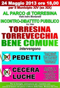 Causa maltempo l’incontro previsto per giovedì 16 è stato spostato a Venerdì 24 maggio alle ore 18:00 nel Parco di Torresina di viale Indro Montanelli, si terrà un incontro dibattito pubblico sul tema TORRESINA TORREVECCHIA BENE COMUNE.