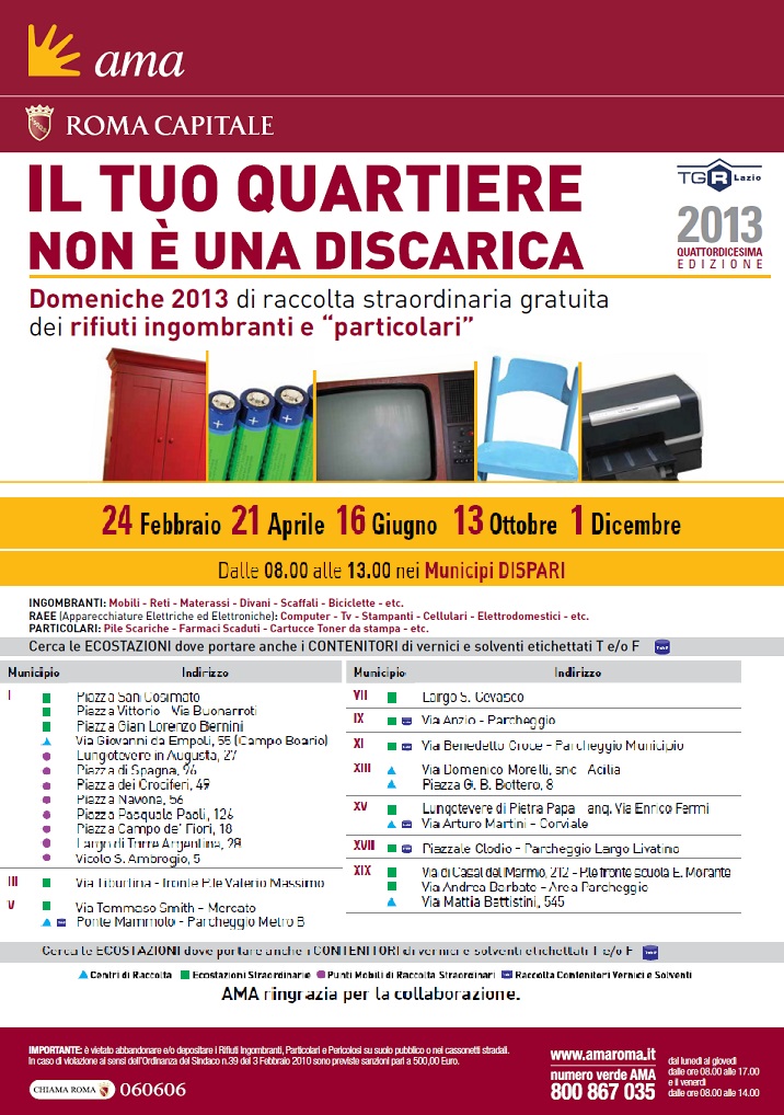 Domenica 13 ottobre torna nei municipi ex-dispari, il primo appuntamento dopo l’estate con la campagna AMA – TGR Lazio “Il Tuo quartiere non è una discarica”, la raccolta straordinaria gratuita di rifiuti ingombranti e RAEE che nel 2012 ha permesso di raccogliere oltre 1.200 tonnellate di materiali (il 70% delle quali avviate al recupero).