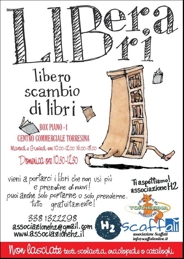 Libera Libri è arrivata a Torresina la scorsa primavera; curata dall’Associazione H2, in collaborazione con il Comitato di Quartiere e l’associazione Scaffali, si basa sul libero scambio di libri. Appuntamento ogni martedì e giovedì, dalle ore 10 alle 12 e dalle 16 alle 18 e la DOMENICA MATTINA, dalle 10,30 alle 12,30. Vi aspettiamo!