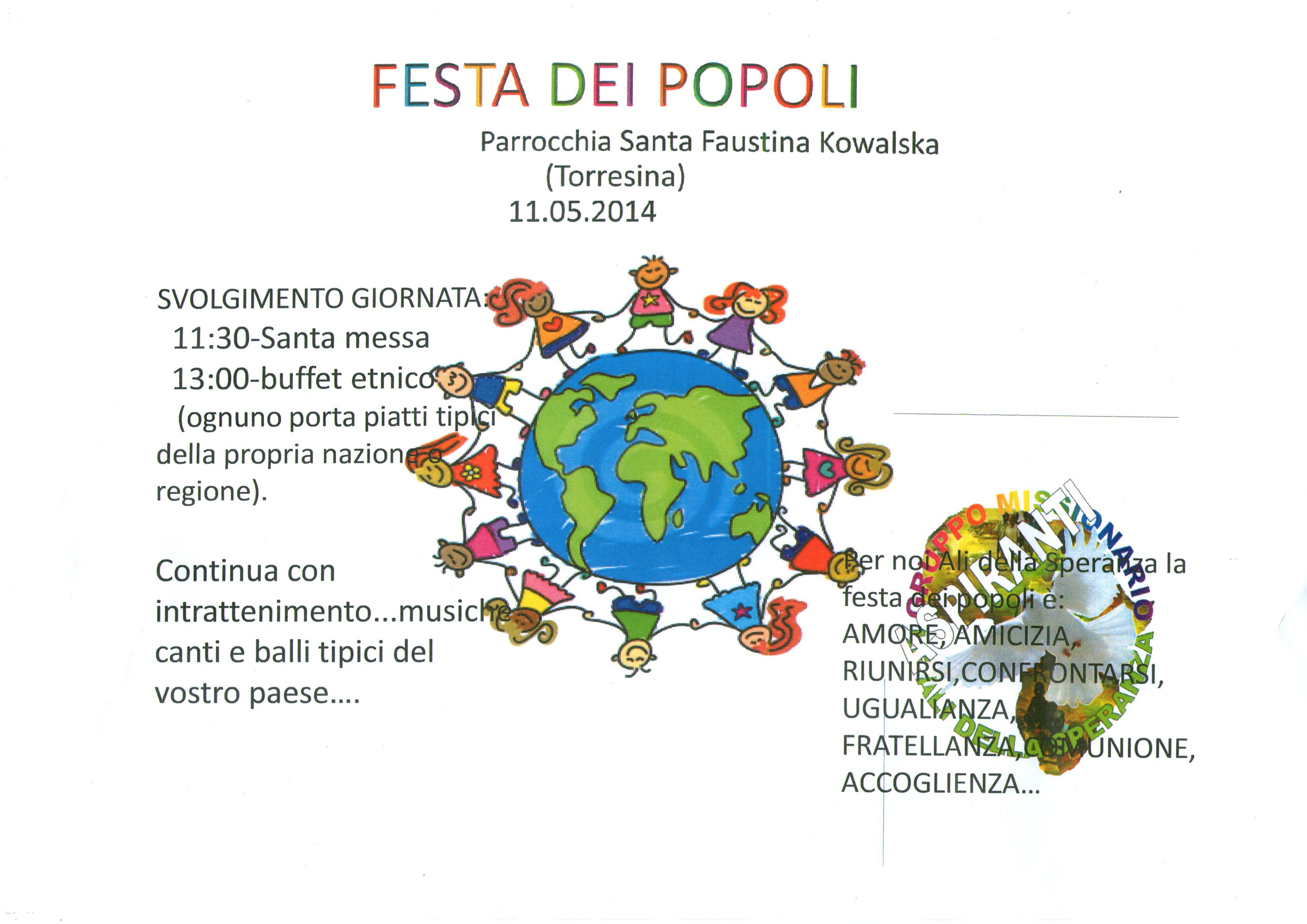 Domenica 11 Maggio 2014 presso la chiesa di Santa Faustina Kowalska a Torresina si festeggerà la Festa dei Popoli. Alle ore 11:30 ci sarà la Santa Messa ed alle ore 13:00 Buffet Etnico: ognuno potrà portare piatti tipici della propria nazione (o regione) di origine da condividere con gli altri. Il pomeriggio proseguirà con intrattenimento, musiche e balli tipici del vostro paese…