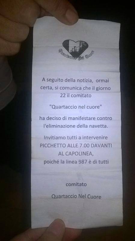 Il neonato comitato “Quartaccio nel Cuore”(non ha nulla a che vedere col progetto di Cardioportezione di Torresina), ha organizzato il blocco di via Andersen in prossimità del capolinea del 916, con tanto di cassonetti rovesciati in mezzo alla strada: il traffico è stato deviato su via dei Monti della Capanna, il servizio di linea del 916 sospeso.