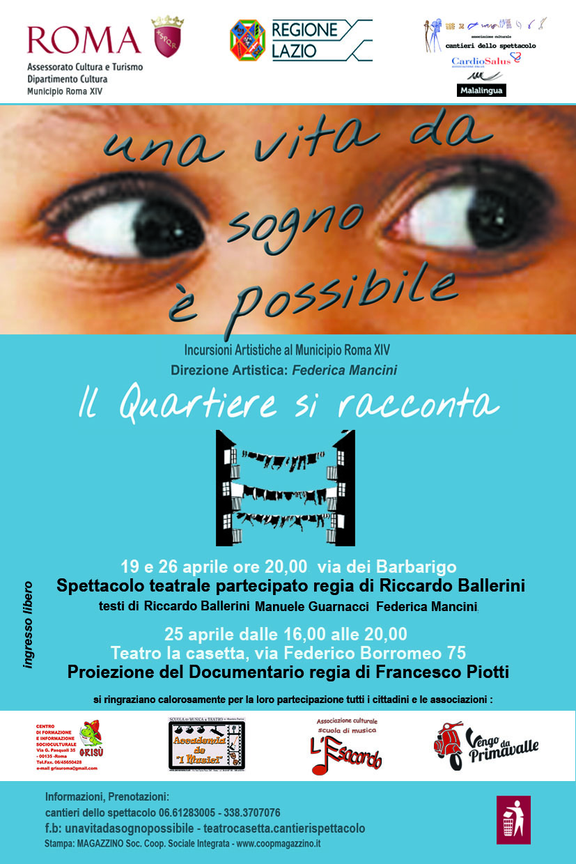 Nelle domeniche 19 e 26 aprile, in via dei Barbarigo (lotti di Primavalle) alle ore 20,00 ci sarà lo spettacolo partecipato, frutto del lungo lavoro di raccolta testi e interviste e incontri con i cittadini del municipio, e sabato 25 presso il Teatro la casetta dalle 16,00 alle 20,00 la proiezione del documentario. Vi preghiamo di darne la massima diffusione e di venire numerosi! Gli eventi sono gratuiti!