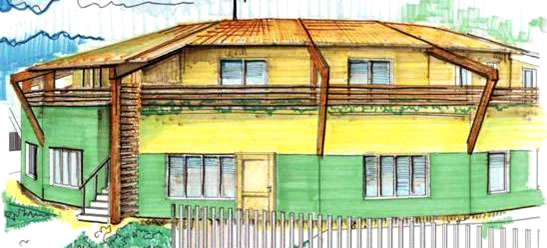 Materiali: il materiale principale scelto per la costruzione è il legno. Sia le strutture che i frangisole che a sud riducono gli apporti termici estivi, sono realizzati in legno.