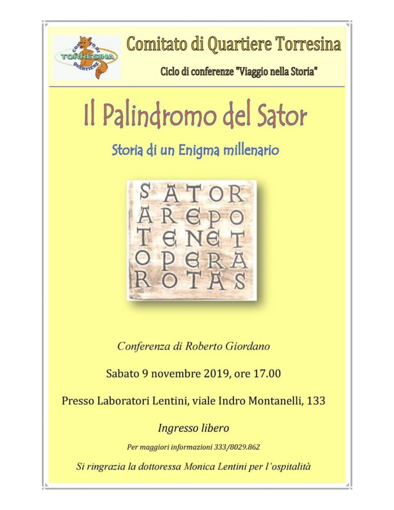 PRESSO LABORATORI LENTINI VIALE MONTANELLI 133Roberto Giordano ci accompagnerà in un affascinante viaggio nella storia alla scoperta di un enigma millenario, il “Palindromo del Sator“.