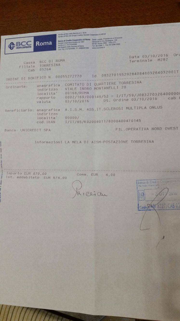 Durante la mattina di domenica 2 ottobre sono stati raccolti 670€ consegnati con bonifico all’AISM.
