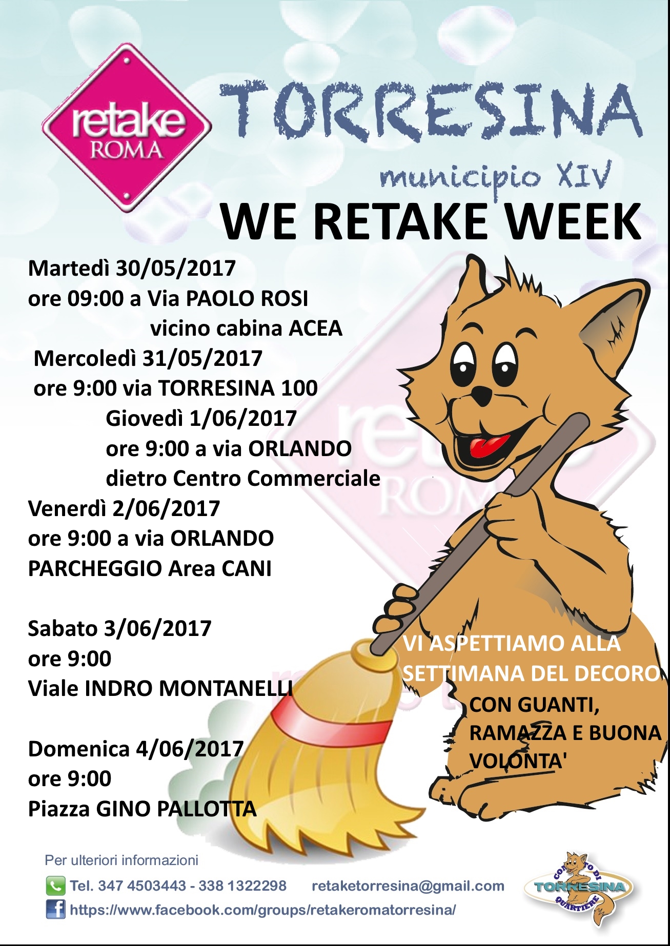il gruppo Retake Roma Torresina ed il Comitato di Quartiere sono liti di annunciare l’arrivo di WE RETAKE WEEK, una Settimana dedicata al decoro del quartiere TORRESINA!!!
