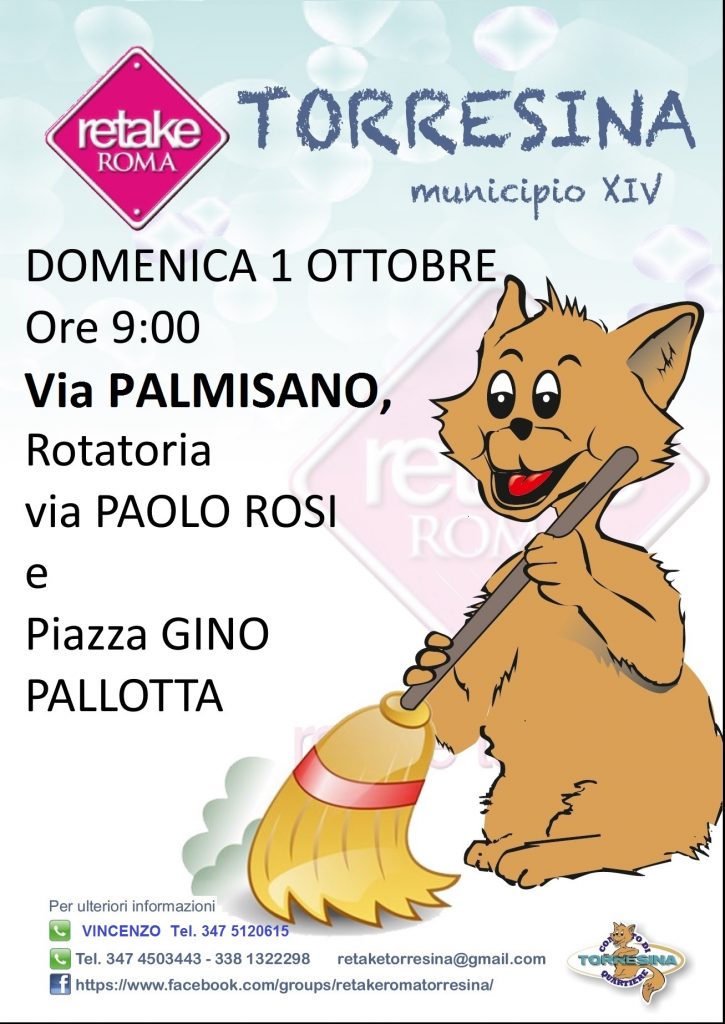 il gruppo RETAKE ROMA TORRESINA, in collaborazione col Comitato di Quartiere, oltre al primo PLOGGING di zona,  sta organizzando una maxi pulizia di PIAZZA GINO PALLOTTA Via MARCELLO PALMISANO e viale INDRO MONTANELLI.