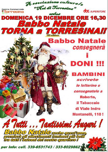 Giunti all’VIII edizione della manifestazione “Babbo Natale torna a Torresina” che negli anni ha riscosso un crescente successo, torniamo ad invitarvi Domenica 19 Dicembre alle ore 16,30 in viale Indro Montanelli.