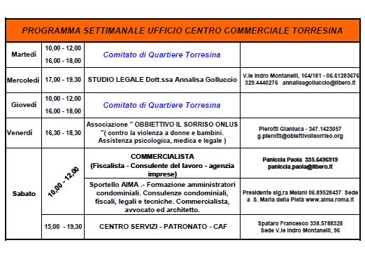 Dalla primavera del 2013 è stato aperto il BOX UFFICI al piano interrato del Centro Commerciale Torresina. In esso sono disponibili gratuitamente, in giorni ed orari prestabiliti, consulenze di vario tipo; attualmente il Box ospita i Volontari del Comitato di Quartiere, lo sportello informativo degli Amici a quattro zampe (a cura di Federico FOIS) e la Consulenza Legale (a cura dell’avv. Annalisa Golluccio)