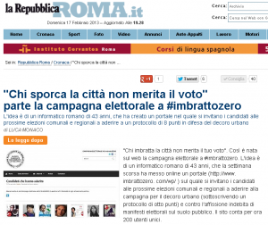 Nelle ore successive sono stato contattato da diversi Candidati che volevano avere informazioni a riguardo, i quali erano favorevoli a sottoscrivere la Carta dei Valori e ad essere inseriti come Aderenti sul sito web www.imbrattozero.com, ovviamente, potranno essere resi pubblici fino a “prova contraria”, cioè quando questi verranno sorpresi in qualsiasi modo, luogo, foto o video a non rispettare la carta dei valori, allora perderanno il “diritto” a rimanere esposti sulla bacheca degli aderenti.