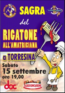 Sabato 15 settembre 2012 a Torresina ci sarà la Sagra del Rigatone all’Amatriciana. A farla tre bravissimi cuochi, Marco, Massimo e Giuseppe che insieme superano il mezzo secolo d’esperienza. L’Amatriciana sarà di quelle classiche, pasta, guanciale e pecorino (niente cipolla!!!), nel rispetto della tradizione. Nel video l’intervista al cuoco Marco Giustiniani che, tra l’altro, è originario proprio della zona di Amatrice (RI), la città dov’è nata la celebre ricetta. Si ringraziano il Supermercato DOC per aver offerto la Pasta ed i Pomodori e la GuidonCarni per la fornitura del Guanciale di Amatrice.