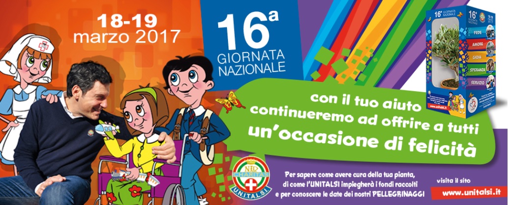 Sabato 18 e domenica 19 marzo 2017, l’UNITALSI celebra la 16ma edizione della sua Giornata Nazionale, proponendo – in oltre 3.000 piazze italiane – una “piantina d’ulivo”, simbolo di pace e fratellanza. Il ricavato delle offerte sarà utilizzato dall’Unitalsi per sostenere la sua attività istituzionale e i numerosi progetti di solidarietà in cui l’associazione è impegnata quotidianamente sull’intero territorio nazionale, al servizio delle persone più deboli, grazie al costante e generoso impegno dei propri soci. Al fianco dei tanti volontari che scenderanno nelle piazze sarà presente Fabrizio Frizzi, un amico oltre che testimonial da 16 anni dell’associazione.