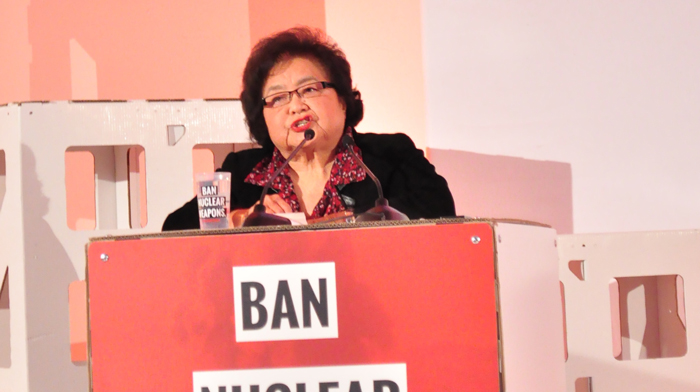 “Rammento i visi dei miei 351 compagni di scuola. Ho un profondo ricordo di ognuno di loro. Voglio che ricordiate che ognuno di loro aveva una vita, aveva un nome… Siamo preoccupati dell’impatto umanitario delle armi nucleari. Finora si parlava di “deterrenza” e di “equilibrio delle forze” e cose del genere. E’ un sollievo vedere che finalmente si parla degli esseri umani e di quello che le armi nucleari fanno agli esseri umani. Tutti questi miei amici sono morti, cancellati dalla faccia della terra. E’ una cosa che non deve più succedere. Dobbiamo mettere al bando queste armi, queste bombe malvagie, tutte e 17.000.”