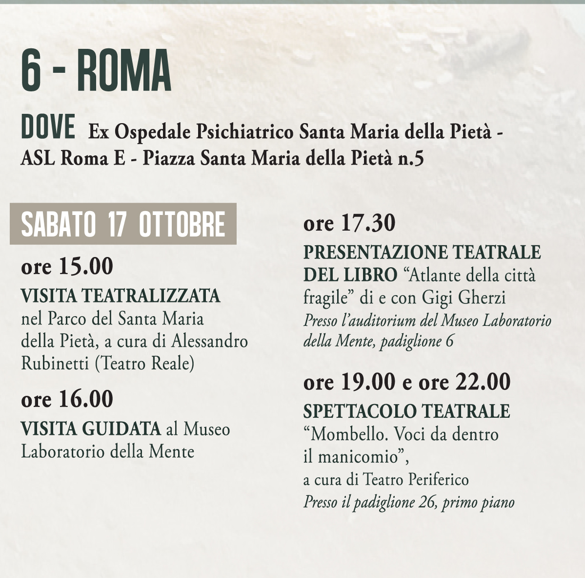 Alle 19.00 verrà presentato il progetto “Un Percorso per La Salute al Santa Maria della Pietà”, interverranno il Rettore IV° Università del “Foro Italico”, Fabio Pigozzi, il Commissario Straordinario della ASL Roma 1, Angelo Tanese, Romano Franceschetti Responsabile UOSD Medicina dello Sport e Antonio Di Pompeo Tecnico Atletica Leggera FIDAL.