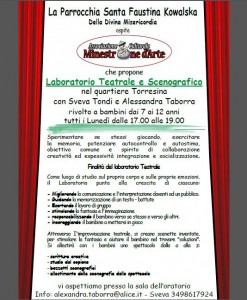 La Parrocchia Santa Faustina Kowalska Della Divina Misericordia ospita il primo Laboratorio Teatrale e Scenografico di Torresina. Responsabili del progetto saranno Sveva Tondi e Alessandra Taborra e si rivolgeranno ai bambini dai 7 ai 12 anni,