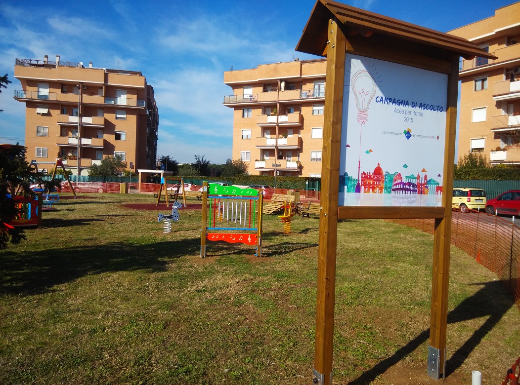 Che con verbale prot. 1485 del 12/01/2016 l’area verde attigua, distinta al catasto terreni al Foglio 196, particella 387 con estensione di 1.393 mq, è stata temporaneamente consegnata ad ACEA s.p.a. per la realizzazione, con finanziamenti a proprio carico, di un parco giochi attrezzato anche per bambini con disabilità nell’ambito della “Campagna di Ascolto Acea per Roma“.